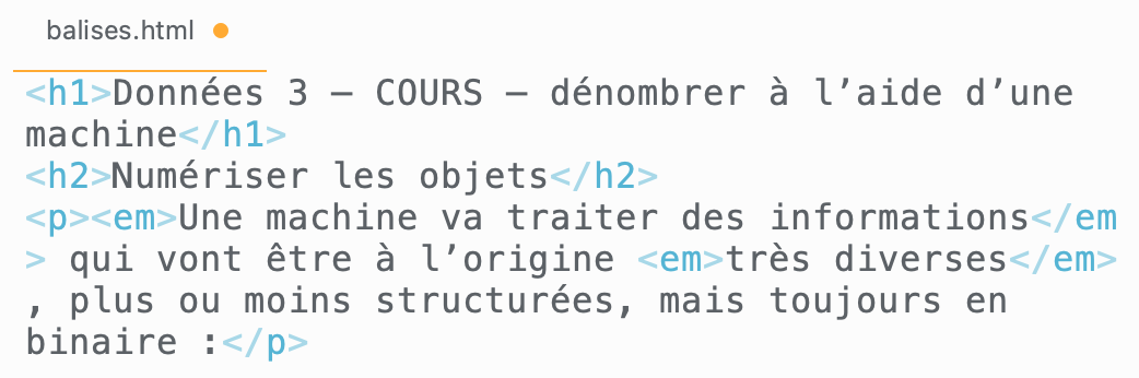 Dans l’editeur, pour structurer le contenu textuel, il n’y a pas de boutons pour choisir les propriétés des éléments. Il faut ajouter DANS LE DOCUMENT des métadonnées. Cela se fait d’une manière très speciale avec le html, à l’aide de BALISES. C’est ce que nous allons voir ici.