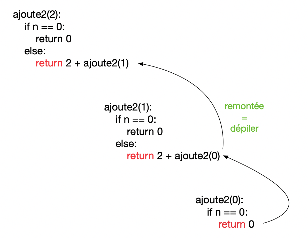 A la fin, ajoute2(4) = 2 + 2 + 2 + 2 + 0 = 8