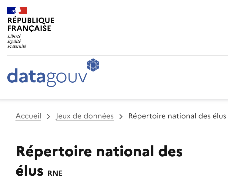 Nous allons consulter les données du Répertoire National des Élus (RNE). Celui-ci a pour finalité le suivi des titulaires d’un mandat électoral. Il est renseigné et tenu à jour par les préfectures et les services du ministère de l’intérieur.
