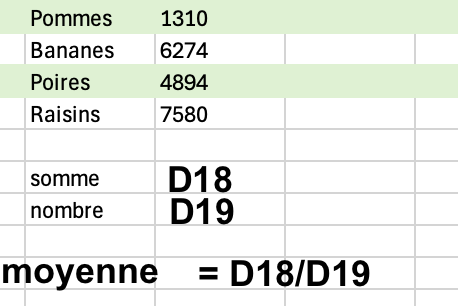 La moyenne des valeurs se calcule en divisant le résultat de SOMME par celui de NOMBRE.